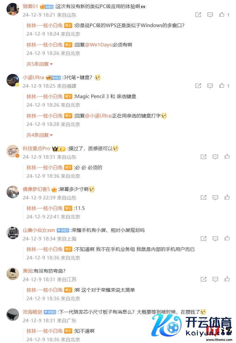 @林林-一枝小白兔 在指摘区中与网友进行相易:针对新平板是否有访佛 PC 级运用的体验,他就多窗口功能给以了细目复兴“必须有啊”;针对平板配件情况,他直言“Magic Pencil 3 和亲选键盘”;针对屏幕尺寸,他回复“11.5”。