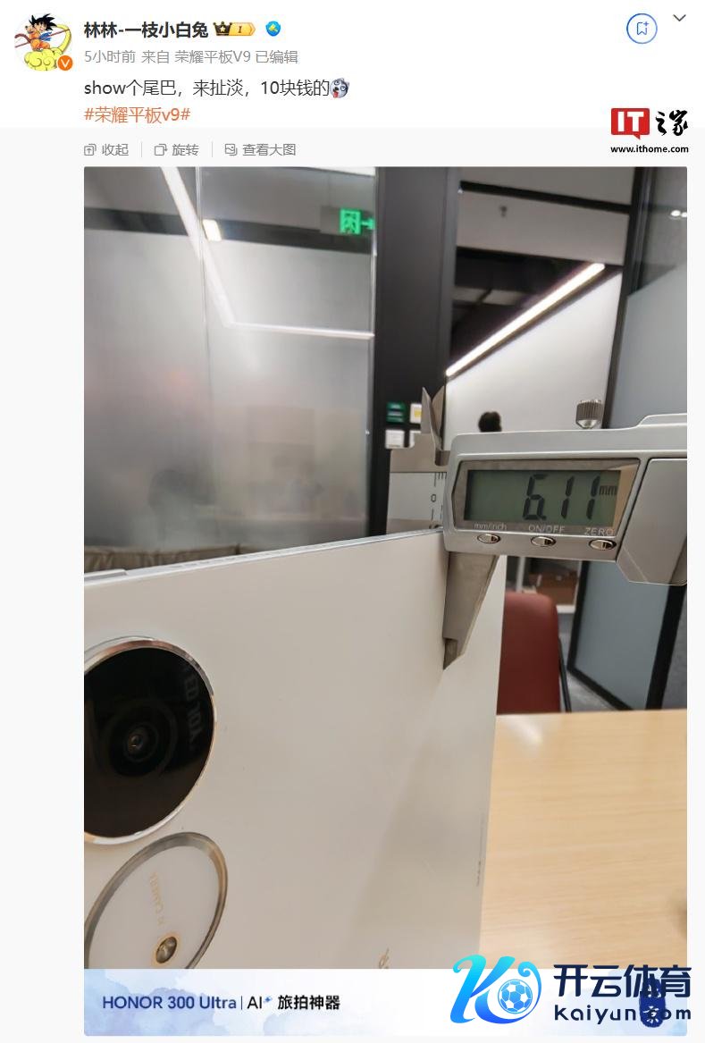荣耀责任主说念主员 @林林-一枝小白兔 当天发文线路了新平板部分信息,其发布的微博配图自大,荣耀平板 V9 厚度为 6.11mm,瞻望将主打轻薄卖点。