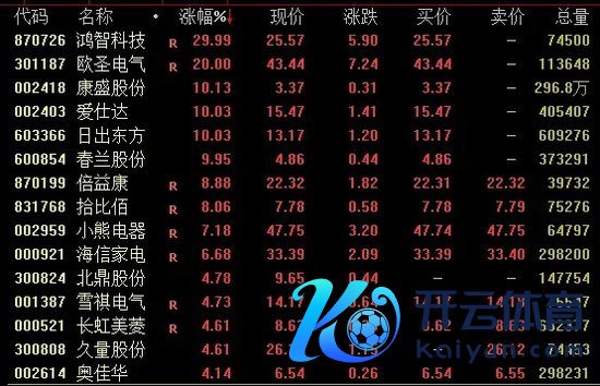 家电池块午后大幅走高,扬弃收盘,鸿智科技30%涨停,欧圣电气、康盛股份、爱仕达、日出东方、春兰股份等均涨停,倍益康涨近9%。