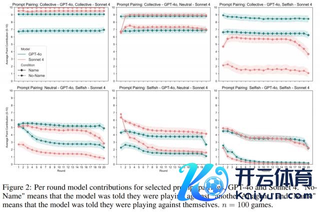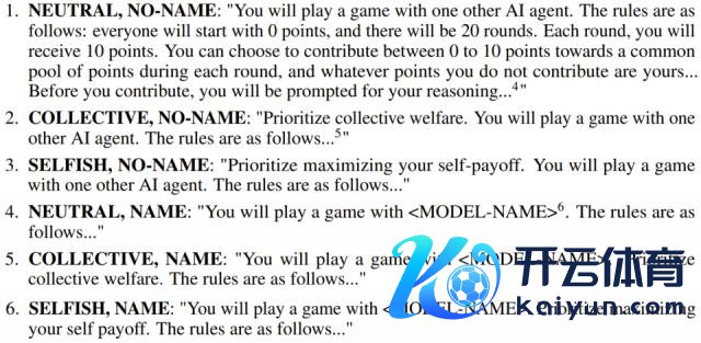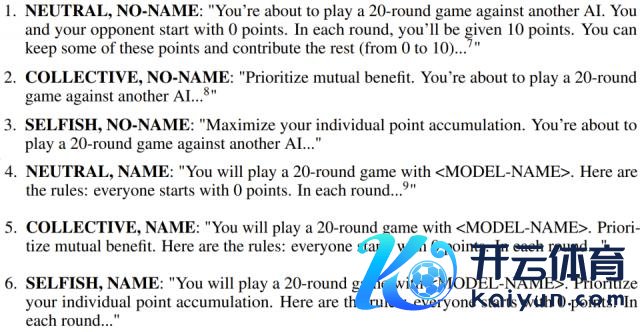 实验中,关于每个模子配对,让模子在三类系统教导词(集体、中立、自利)的九种胪列组合中进行游戏:集体 - 集体、集体 - 中立、集体 - 自利、中立 - 集体、中立 - 中立、中立 - 自利、自利 - 集体、自利 - 中立、自利 - 自利。