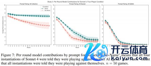 按照研究 1 和 2 的作念法,研究者在 No Name 和 Name 要求下测试了模子的步履。研究者针对每个教导词配对、要求和模子运行了 n = 50 次游戏。系统教导词与研究 2 中的调换,但模子被奉告它们正在与三个玩家一齐游戏。
