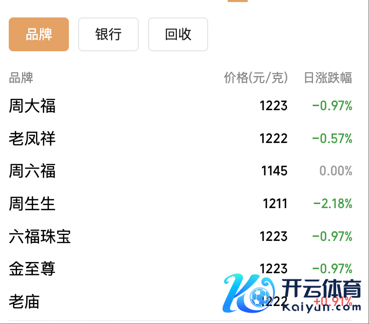 国内黄金饰品克价也从1290元傍边高台跳水。10月23日,老庙足金报价1222元/克,较10月21日的1294元/克跌去72元/克;老凤祥报1222元/克,较10月21日跌68元/克;周大福报1223元/克,较10月21日跌69元/克。
