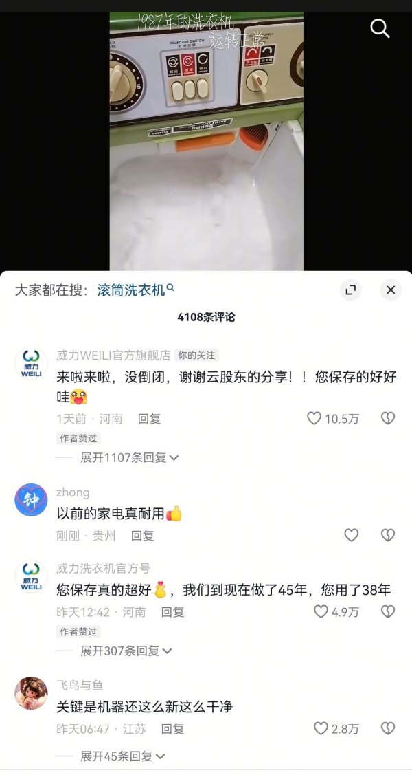 极目新闻记者 张皓kaiyun平台登录入口 9月7日,有河北网友发视频称,1987年的洗衣机出手泛泛。“比我岁数齐大,相称好用,听我老娘说,当时候400买的。” 当事东谈主外交账号视频截图 数据知晓,上述视频发布一天时分,有10多万网友转评赞。记者私信视频发布者,暂未获申诉。 威力WEILI官方旗舰店8日在辩驳区申诉:“来啦来啦,没倒闭,谢谢云鼓动的共享!”“您保存得真好,咱们到现时作念了45年,您用了38年。” 网友称我方家的洗衣机是1987年买的 有网友不才方申诉:“这不......